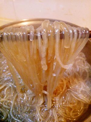 把买来的番薯粉丝泡进水中,我没经验,先用了冷水泡了半天,还是比较硬,后来用热水泡,20分钟就软了~