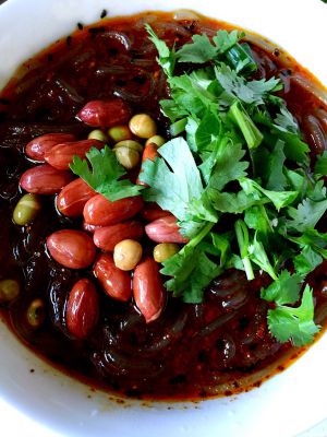 碗中放入醋、生抽、盐,再放入煮好的粉丝,浇入热汤,撒上黄豆、花生米、香菜叶、小葱、榨菜。