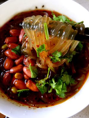 放入煮好的红薯粉,加入花生 香菜 榨菜拌匀就可以了