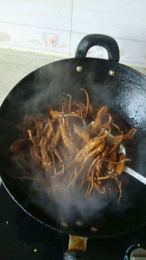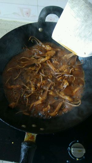 然后加入生抽,老抽再继续炒一下,大概炒一两分钟就好,加入开水