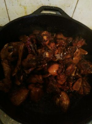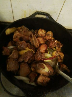 糖炒好后,放入鸭块,翻炒,鸭子油多,稍微多炒会