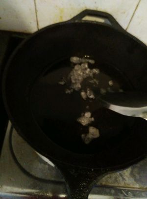 鸭子剁块后焯水备用,这一步忘记拍照了,然后锅里加多点油,放入油后就放入冰糖,大块的放两块,小的放七八块。然后在油热的过程中,用铲子把冰糖轻轻拍碎,然后慢慢搅拌,让糖都化了,糖全化后,慢慢搅拌成浅褐色