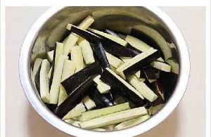 倒上油,将腌制的茄子皮挨个摆放好,现将茄子皮的部位炸制焦透。大火转小火炸。