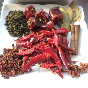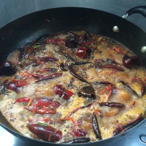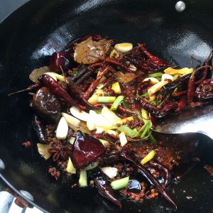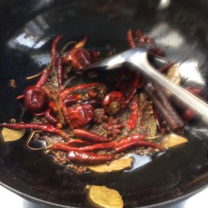 香料、辣椒入锅,炒出香味,加入郫县豆瓣酱,炒出香味