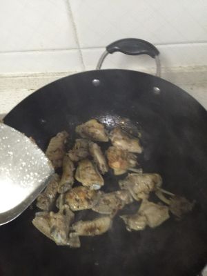 葱片姜片放入油中爆香,放入鸡翅翻炒至金黄,加老抽和料酒、盐和糖。