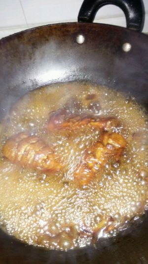 捞出后沥干水分,锅内放油,加入姜,蒜,干辣椒爆炒,炒出香味后,放入鸡翅,炒至金黄色。