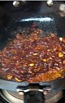 锅热后注入适量油,放入豆瓣酱炒香后加姜末翻炒,出香味后加入辣椒粉,大火翻炒(注意不要糊底)