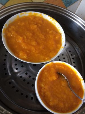 25分钟后开锅,用勺子捣烂南瓜成泥装,可以适量加些糖(根据喜好),放在一边晾至常温