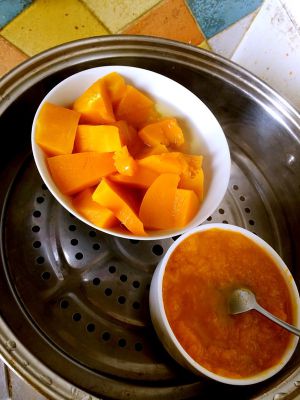 将南瓜洗净削皮切成小块放上蒸锅,(注意要用碗装南瓜哦,因为蒸南瓜会出来很多水,盘子盛不住哦~)水开后蒸上25分钟。