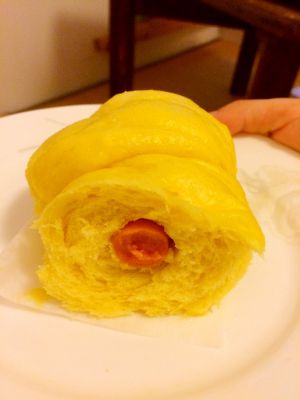 发酵后(发酵完的图没有拍),面团变成原来的两倍大。将面团搓成喜欢的形状,做馒头。可以搓成圆柱长条,用刀一段段切来,就是刀切馒头。也可以搓成细长条,缠绕在火腿肠上,就是热狗卷。二次发酵二十分钟。