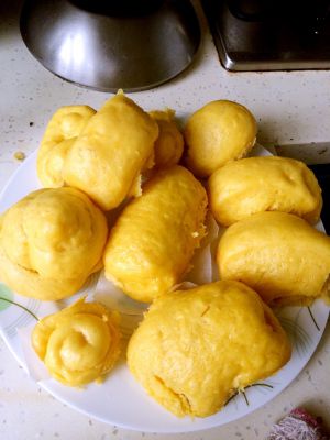取350g低筋粉与酵母和混合,将凉到40度以下的南瓜泥(温度太高会使酵母失去活性)慢慢活入面粉,揉成不粘手的面团。盖上保鲜膜静置发酵一个半小时。