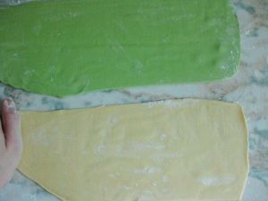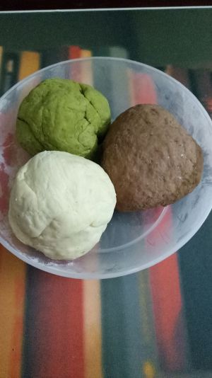 将上5种材料搓成面团,分成三等份。抹茶粉和可可粉分别加小许温水,搓成绿面团和可可粉面团。