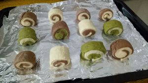 卷起后切成一块块,进行发酵。烤箱150度开5分钟,然后关掉电源,将馒头和一杯温水放进去进行发酵。