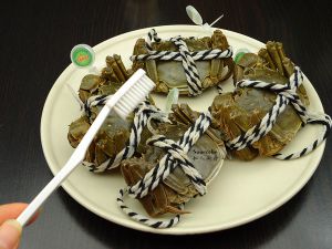 吃之前要拿一个细的牙刷,将螃蟹的各个部位都洗刷干净。这个活一定要交给一家之主干,哈哈。