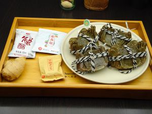 准备食材,大闸蟹、紫苏包、蟹醋、生姜、老姜红糖茶;