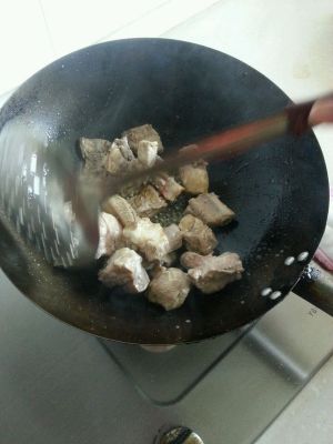 热锅冷油,放八角和姜片爆香放排骨和五花肉,炒表皮发黄。