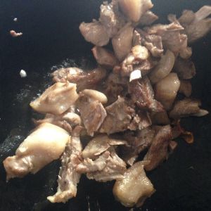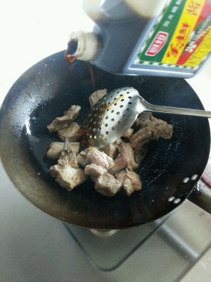加入排骨,翻炒,加葱姜蒜,再加入酱油和料酒。颜色基本就出来了:-)