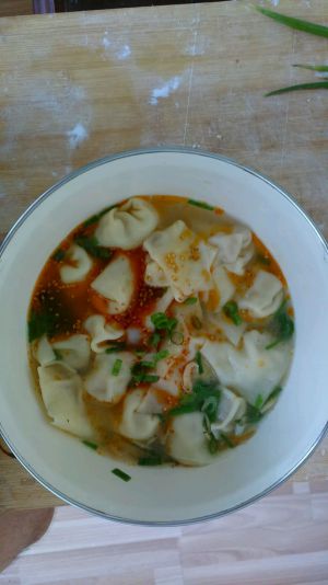 待馄饨煮好后打捞放入汤碗内,最后加入辣椒油,撒上少许芝麻、葱花,完美!