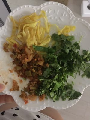 取一个鸡蛋打散倒入不粘锅平底锅中摊成鸡蛋饼,切记不要放油,将摊好的鸡蛋饼切成条状待用。将榨菜切碎待用。香菜切碎待用。