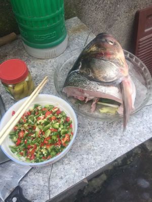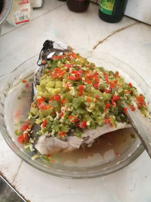 剁椒和蒸鱼豉油混合铺上鱼头,继续蒸7分钟,取出放入葱花,浇热油即可上桌