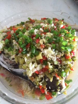 蒸至5分钟时,开盖倒掉盘子里蒸鱼的腥水,铺上剁椒和炸过姜蒜末,盖锅大火再蒸15分钟。