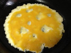 平底锅倒少许食用油,将打散的鸡蛋液倒进去,还是中小火就可以了,不要翻动蛋液,等蛋液定型;