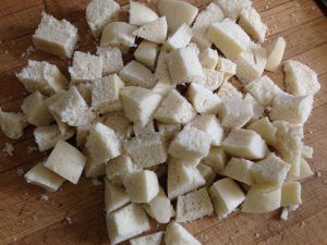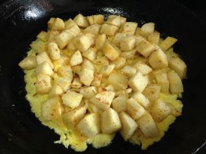 等蛋液快要全部成型的时候,倒上煎好的馒头丁,有些馒头丁会包在蛋液里,蛋液完全熟透后就会和馒头丁合为一体;