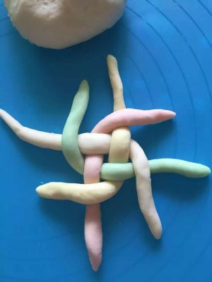 绣球馒头的做法,分别搓四条差不多粗的面条,按图所示摆放
