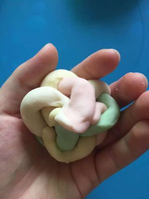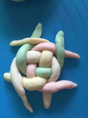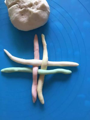 我这里使用的是现成的色素,和好面团后分开大概4份,3份面团分别添加色素并揉匀,最后一份不加颜色,保持原色