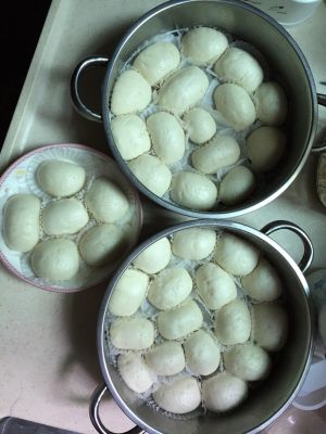 造型完成用面包纸垫着放进蒸架,进行二次醒发,大概15到20分钟左右,然后蒸25分钟,关火闷3分钟后出炉(不要一关火就开锅盖,不然包子会回缩;关火闷的时间不要太长,不然水蒸气会回滴,包子表面就不平整了,3到5分钟的关火闷是最适宜的)