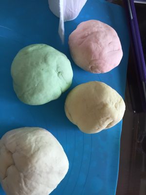 所有食材(除猪油)混在一起,揉成面团后加入猪油,揉搓至光滑无气泡。分割出所需份量,揉入色粉。除了两个大块各60克,其余基本没有称量,最后剩了块粉色,做了个小豆沙包,结尾图片可见。