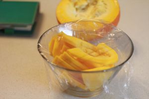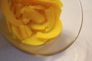 南瓜去皮,切大片,蒙保鲜膜,微波炉3分半。