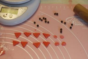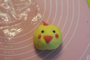 50g面粉加25g水,5滴红色食用色素,揉匀,擀开,切出鸡嘴,腮红,鸡冠。