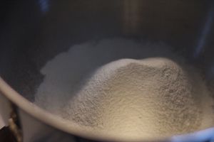 350g面粉混合细砂糖,酵母过筛。