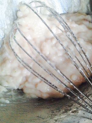 之后加蛋清、淀粉、油、鸡粉,一边打,一边慢慢的放入。最后再放盐调味,变成冻了