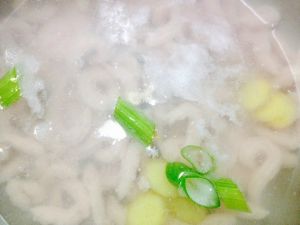锅放羊汤(无油)把羊肉片、鱼条、青菜一起炖至开锅关火。用胡椒粉、盐调味。