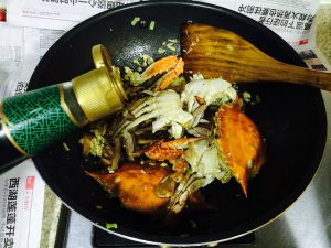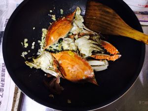 下梭子蟹翻炒,炒到全部变色,下香菇一起炒。