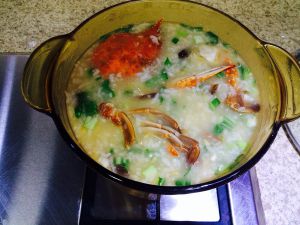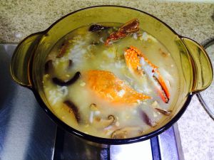将炒好的梭子蟹盛进八成熟的稀饭中继续煮。