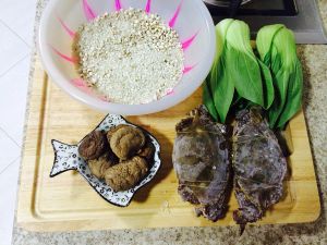 准备好主要材料:米洗净用水泡一夜,香菇泡发切丝,梭子蟹洗净扒开壳子去腮和肺,切块,青菜洗净切碎。