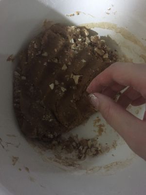 回软的黄油加红糖打发; 少量分次加入蛋液打匀,避免油水分离; 加入低粉和泡打粉,稍微拌成松散状后加入核桃碎;