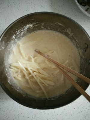 加入面粉,盐,鸡蛋,清水搅拌均匀成糊状。