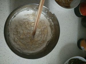 倒进去一点面,搅匀,可以放一点点水也可以不放,但面一定是流面,不要太稠了