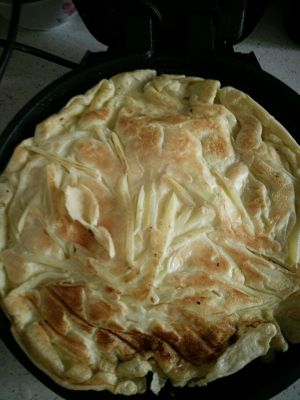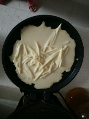 电饼铛提前预热好倒好油,把油在电饼铛上抹均匀,放入鸡蛋土豆丝面,形成饼行,厚度一致