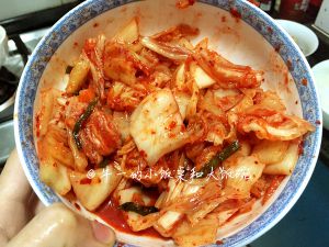 买来现成的韩式泡菜切成小块,2厘米见方即可。