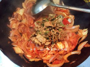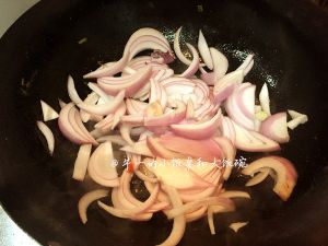 葱花下锅煸葱油,香味出来下肉片,泡菜也下锅炒下会更好吃,然后放入洋葱。