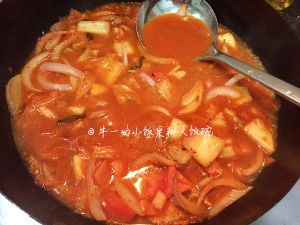 加热水炖煮。开锅后加入豆腐、土豆、年糕。加辣酱小火炖煮。