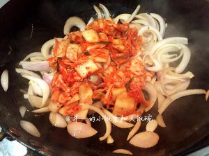 锅中放油,油热加入切好的泡菜适当翻炒。后放洋葱大火爆香。
