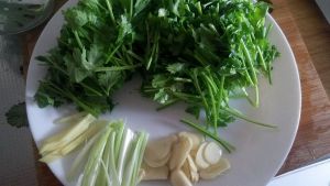 香菜切段 姜、大葱切丝 大蒜切片……待用