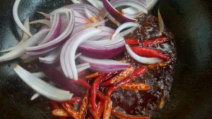 炒出红油后放入白糖,耗油,生抽,然后加入小米辣,洋葱翻炒两下