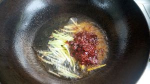锅中热油,葱丝姜丝爆锅,加入郫县豆瓣酱